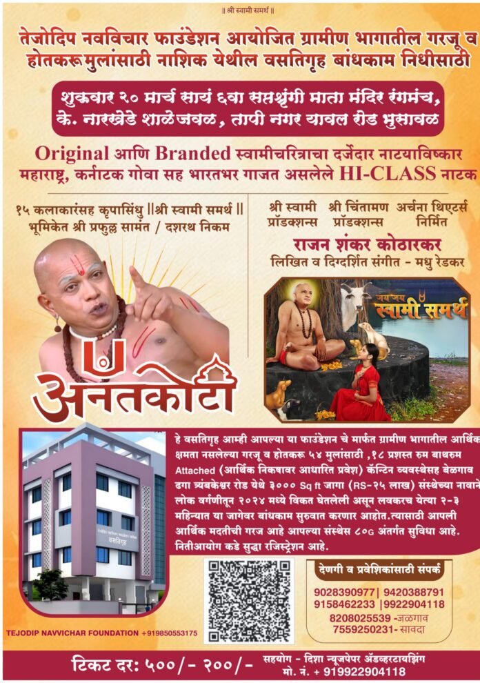 тАШрдЕрдирдВрддрдХреЛрдЯреАтАЩ рд╣реЗ рдирд╛рдЯрдХ рд╢реНрд░реА рд╕реНрд╡рд╛рдореА рд╕рдорд░реНрде рдпрд╛рдВрдЪреНрдпрд╛ рдЬреАрд╡рдирд╛рд╡рд░ рдЖрдзрд╛рд░рд┐рдд рджрд░реНрдЬреЗрджрд╛рд░ рдирд╛рдЯреНрдпрд╛рд╡рд┐рд╖реНрдХрд╛рд░ рдЕрд╕реВрди рдорд╣рд╛рд░рд╛рд╖реНрдЯреНрд░рд╛рд╕рд╣ рдХрд░реНрдирд╛рдЯрдХ рдЖрдгрд┐ рдЧреЛрд╡рд╛ рд░рд╛рдЬреНрдпрд╛рддрд╣реА рдЧрд╛рдЬрд▓реЗ рдЖрд╣реЗ.