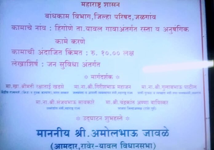 यावल तालुक्यातील हिंगोणा येथे आमदार निधीतून करण्यात आलेल्या जनसुविधा अंतर्गत डांबरीकरण रस्त्याच्या कामावर गंभीर प्रश्नचिन्ह उपस्थित झाले आहे. सदर काम अत्यंत निकृष्ट दर्जाचे झाल्याची तक्रार ग्रामस्थांनी केली असून, याबाबत मुख्य कार्यकारी अधिकारी, जळगाव बांधकाम विभाग यांच्याकडे अधिकृत निवेदन सादर करण्यात आले आहे.