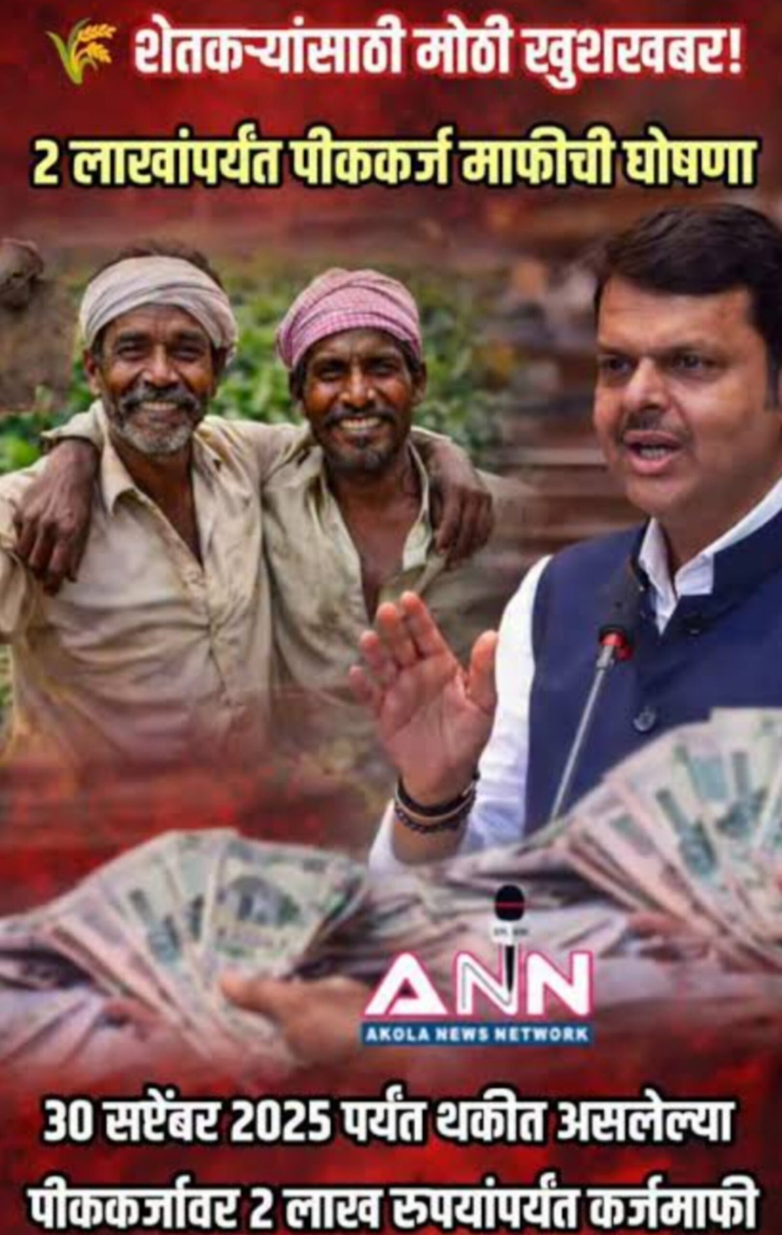 рд░рд╛рдЬреНрдпрд╛рдЪреЗ рдореБрдЦреНрдпрдордВрддреНрд░реА Devendra Fadnavis рдпрд╛рдВрдиреА рдЕрд░реНрдерд╕рдВрдХрд▓реНрдкреАрдп рднрд╛рд╖рдгрд╛рдд рд╣реА рдШреЛрд╖рдгрд╛ рдХрд░рддрд╛рдирд╛ рд╕рд╛рдВрдЧрд┐рддрд▓реЗ рдХреА, рейреж рд╕рдкреНрдЯреЗрдВрдмрд░ реирежреирел рдкрд░реНрдпрдВрдд рдердХреАрдд рдЕрд╕рд▓реЗрд▓реНрдпрд╛ рдкреАрдХ рдХрд░реНрдЬрд╛рд╡рд░ реи рд▓рд╛рдЦ рд░реБрдкрдпрд╛рдВрдкрд░реНрдпрдВрдд рдХрд░реНрдЬрдорд╛рдлреА рджреЗрдгреНрдпрд╛рдд рдпреЗрдИрд▓. рдпрд╛рд╢рд┐рд╡рд╛рдп рдЬреЗ рд╢реЗрддрдХрд░реА рдирд┐рдпрдорд┐рддрдкрдгреЗ рдХрд░реНрдЬрдлреЗрдб рдХрд░рдд рдЖрд╣реЗрдд рддреНрдпрд╛рдВрдирд╛ рдкреНрд░реЛрддреНрд╕рд╛рд╣рди рдореНрд╣рдгреВрди релреж рд╣рдЬрд╛рд░ рд░реБрдкрдпрд╛рдВрдЪреА рдЖрд░реНрдерд┐рдХ рдорджрдд рджреЗрдгреНрдпрд╛рдЪрд╛рд╣реА рдирд┐рд░реНрдгрдп рд╕рд░рдХрд╛рд░рдиреЗ рдШреЗрддрд▓рд╛ рдЖрд╣реЗ.