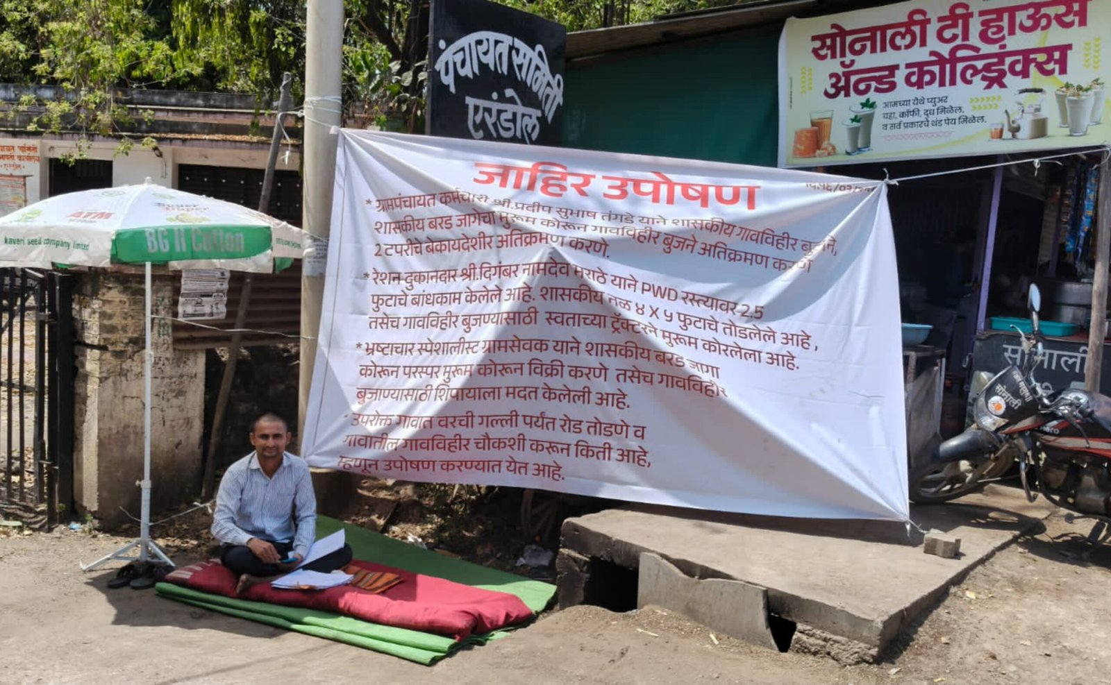 рд╕реЛрдорд╡рд╛рд░, резрем рдорд╛рд░реНрдЪ реирежреирем рдкрд╛рд╕реВрди рд╕рдХрд╛рд│реА резрез рддреЗ рд╕рдВрдзреНрдпрд╛рдХрд╛рд│реА рел рдпрд╛ рд╡реЗрд│реЗрдд рдПрд░рдВрдбреЛрд▓ рдкрдВрдЪрд╛рдпрдд рд╕рдорд┐рддреА рдХрд╛рд░реНрдпрд╛рд▓рдпрд╛рд╕рдореЛрд░ рддреНрдпрд╛рдВрдиреА рдЬрд╛рд╣реАрд░ рдЙрдкреЛрд╖рдг рд╕реБрд░реВ рдХреЗрд▓реЗ рдЖрд╣реЗ. рдЖрдВрджреЛрд▓рдирд╛рдЪреНрдпрд╛ рдкрд╣рд┐рд▓реНрдпрд╛рдЪ рджрд┐рд╡рд╢реА рдкреНрд░рд╢рд╛рд╕рдирд╛рддреАрд▓ рдЕрдзрд┐рдХрд╛рд░реА рддреНрдпрд╛рдВрдЪреА рднреЗрдЯ рдШреЗрдгреНрдпрд╛рд╕рд╛рдареА рдЖрд▓реЗ рдЖрдгрд┐ рдЖрдВрджреЛрд▓рди рдорд╛рдЧреЗ рдШреЗрдгреНрдпрд╛рдЪреА рд╡рд┐рдирдВрддреА рдХреЗрд▓реА. рдорд╛рддреНрд░, рдареЛрд╕ рдирд┐рд░реНрдгрдп рди рдЭрд╛рд▓реНрдпрд╛рдиреЗ рдорд░рд╛рдареЗ рдпрд╛рдВрдиреА рдЙрдкреЛрд╖рдг рд╕реБрд░реВрдЪ рдареЗрд╡рдгреНрдпрд╛рдЪрд╛ рдирд┐рд░реНрдзрд╛рд░ рд╡реНрдпрдХреНрдд рдХреЗрд▓рд╛ рдЖрд╣реЗ.