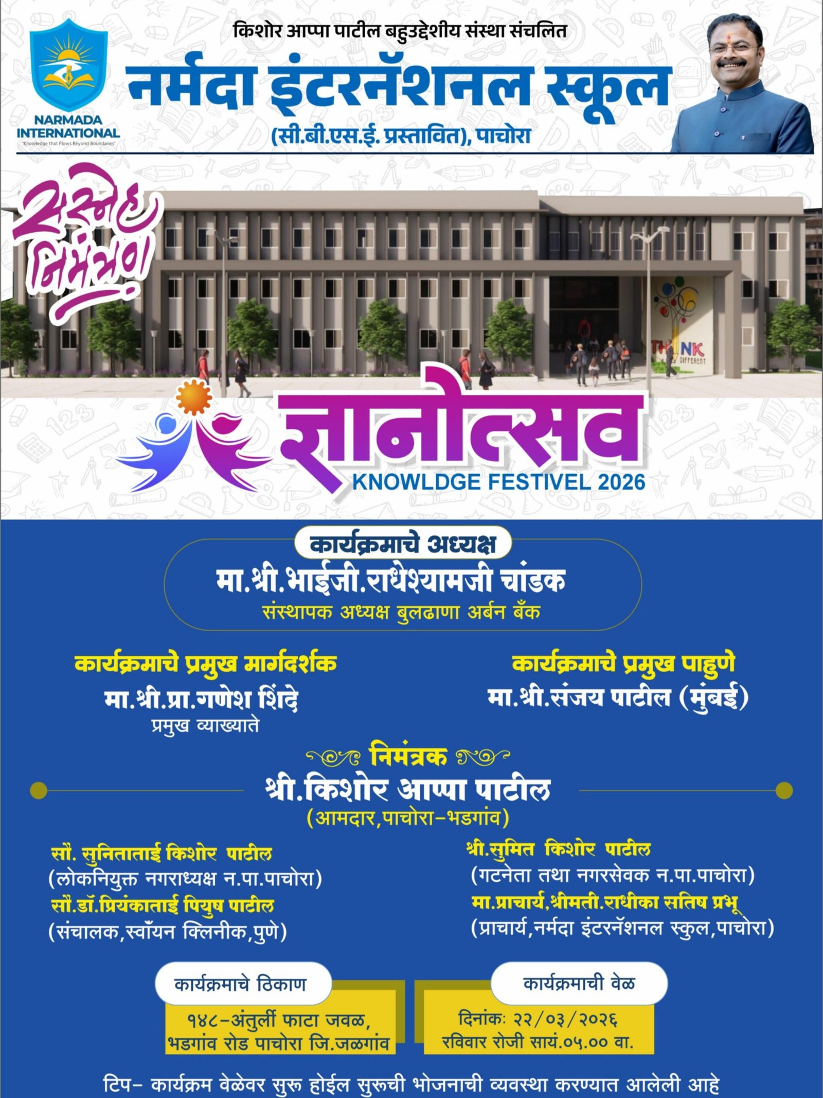 рдкрд╛рдЪреЛрд░рд╛ рд╢рд╣рд░рд╛рдд рд╢рд┐рдХреНрд╖рдг рдХреНрд╖реЗрддреНрд░рд╛рдд рдирд╡реЗ рдкрд░реНрд╡ рд╕реБрд░реВ рд╣реЛрдд рдЕрд╕реВрди, рднрдбрдЧрд╛рд╡ рд░реЛрдбрд╡рд░реАрд▓ рдЕрдВрддреБрд░реНрд▓реА рдлрд╛рдЯреНрдпрд╛рдЬрд╡рд│ рдЙрднрд╛рд░рдгреНрдпрд╛рдд рдЖрд▓реЗрд▓реНрдпрд╛ рдирд░реНрдорджрд╛ рдЗрдВрдЯрд░рдиреЕрд╢рдирд▓ рд╕реНрдХреВрд▓рдЪреНрдпрд╛ рдкреНрд░рд╛рдВрдЧрдгрд╛рд╡рд░ рджрд┐. реиреи рдорд╛рд░реНрдЪ (рд░рд╡рд┐рд╡рд╛рд░) рд░реЛрдЬреА рд╕рд╛рдпрдВрдХрд╛рд│реА рел рд╡рд╛рдЬрддрд╛ рднрд╡реНрдп тАШрдЬреНрдЮрд╛рдиреЛрддреНрд╕рд╡тАЩ рдХрд╛рд░реНрдпрдХреНрд░рдорд╛рдЪреЗ рдЖрдпреЛрдЬрди рдХрд░рдгреНрдпрд╛рдд рдЖрд▓реЗ рдЖрд╣реЗ. ЁЯОЙЁЯУЦ